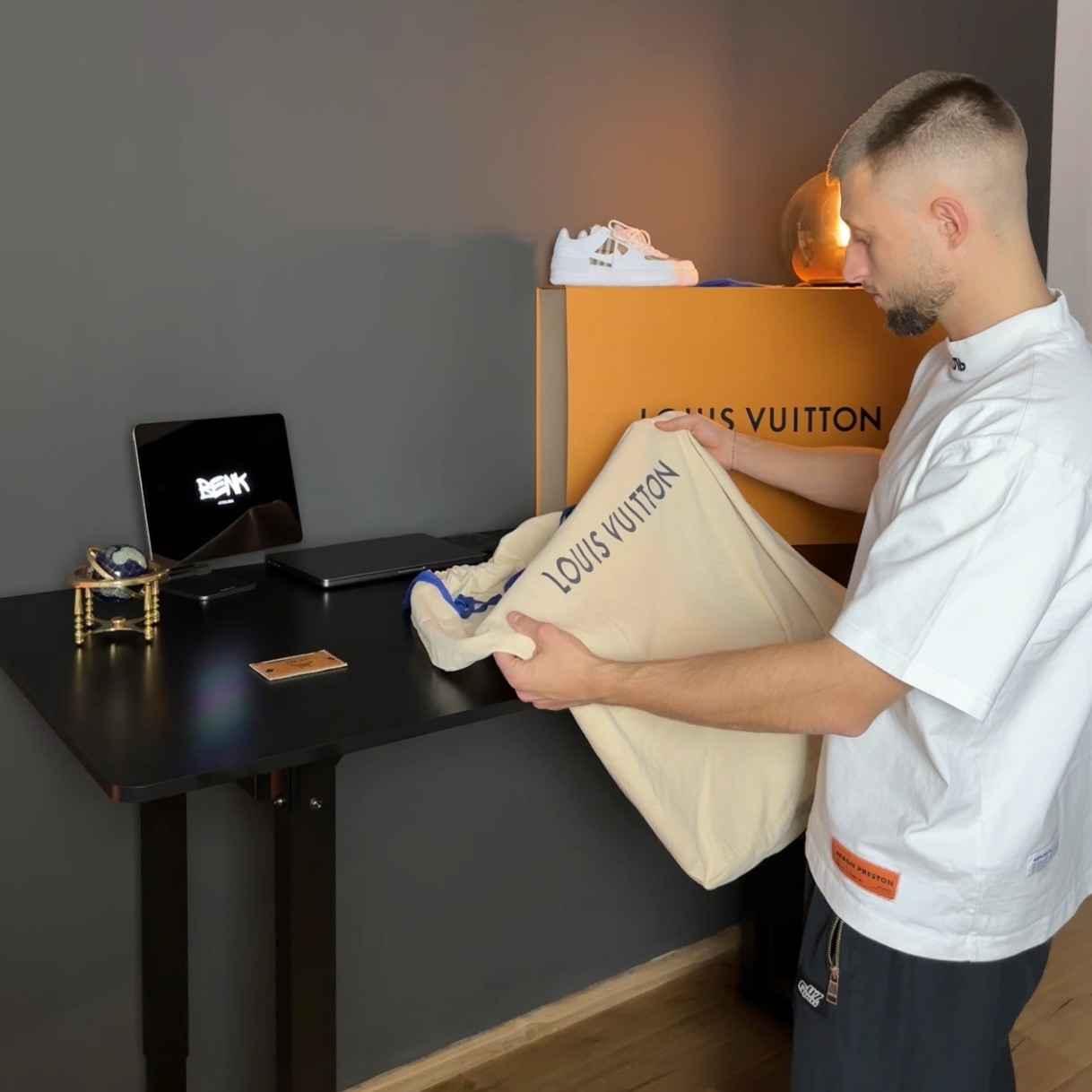 Alongside my work in music, I also found creative success in custom fashion and sneaker design. I designed custom sneakers and clothing pieces from designer materials, cutting up original LV bags to create artistic sneakers and repurposing LV dust bags into unique clothing pieces. This project attracted significant attention, leading to collaborations with major influencers across Germany.